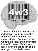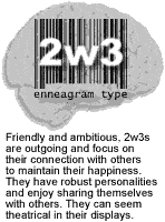 <div align="center"><table border="0" cellpadding="0" cellspacing="2" width="240"bgcolor="#e7e4e4"><tr> <td width="50%"><div align="center"> Conscious self</div> </td><td><div align="center">Overall self</div></td> </tr><tr><td width="50%"><div align="center"><img src="http://similarminds.com/images/2w3.gif" border="0"></div> </td><td><div align="center"><img src="http://similarminds.com/images/4w3-mean.gif" border="0"></div> </td></tr></table><a href="http://similarminds.com">Take Free Enneagram Test</a></div> |