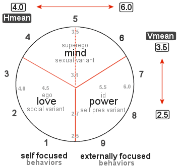 Your results on all types are calculated into two mean scores. Your Vmean is 3.11 and your Hmean is 4.65. Plotting them on the Enneagram map determines your overall mean type which is 4w3. (To learn more about the rational/formula behind this test click here.) |